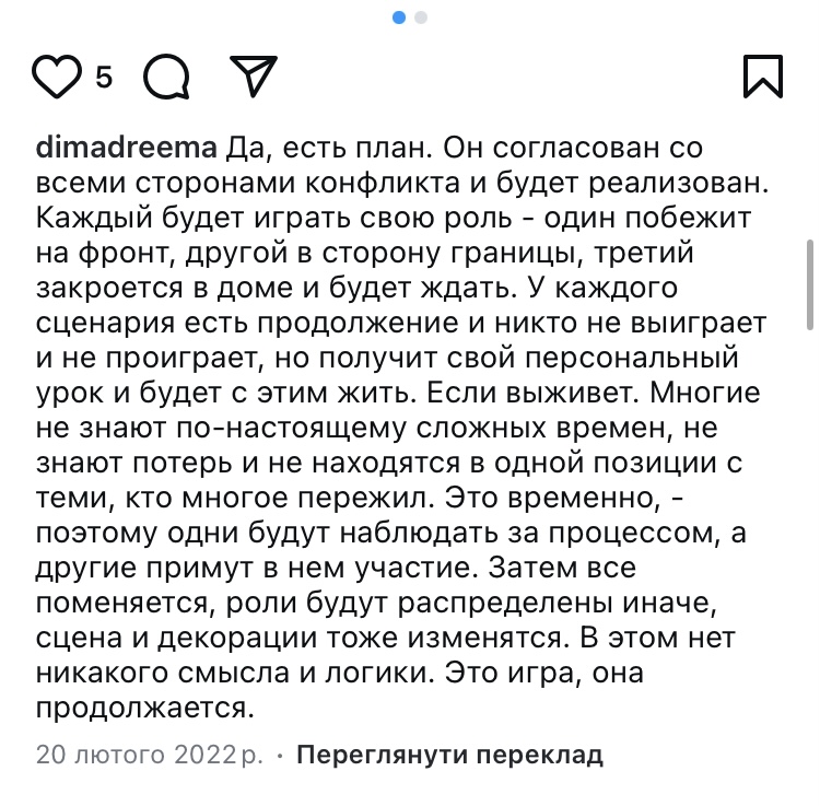 У одному з дописів в своєму Instagram Кузнецов ще 20-го лютого 2022-го року написав: «Да, есть план. Он согласован со всеми сторонами конфликта и будет реализован. Каждый будет играть свою роль – один побежит на фронт, другой в сторону границы, третий закроется в доме и будет ждать. У каждого сценария есть продолжение и никто не выиграет и не проиграет, но получит свой персональный урок и будет с этим жить. Если выживет. Многие не знают по-настоящему сложных времен, не знают потерь и не находятся в одной позиции с теми, кто многое пережил. Это временно, – поэтому одни будут наблюдать за процессом, а другие примут в нем участие. Затем все поменяется, роли будут распределены иначе, сцена и декорации тоже изменятся. В этом нет никакого смысла и логики. Это игра, она продолжается».