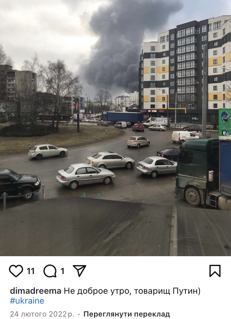 У публікації 24-го лютого, на якій видно наслідки влучання ракети і за якою можливо геолокувати і підтвердити результат удару, підсудний написав: «Не доброе утро, товарищ Путин».