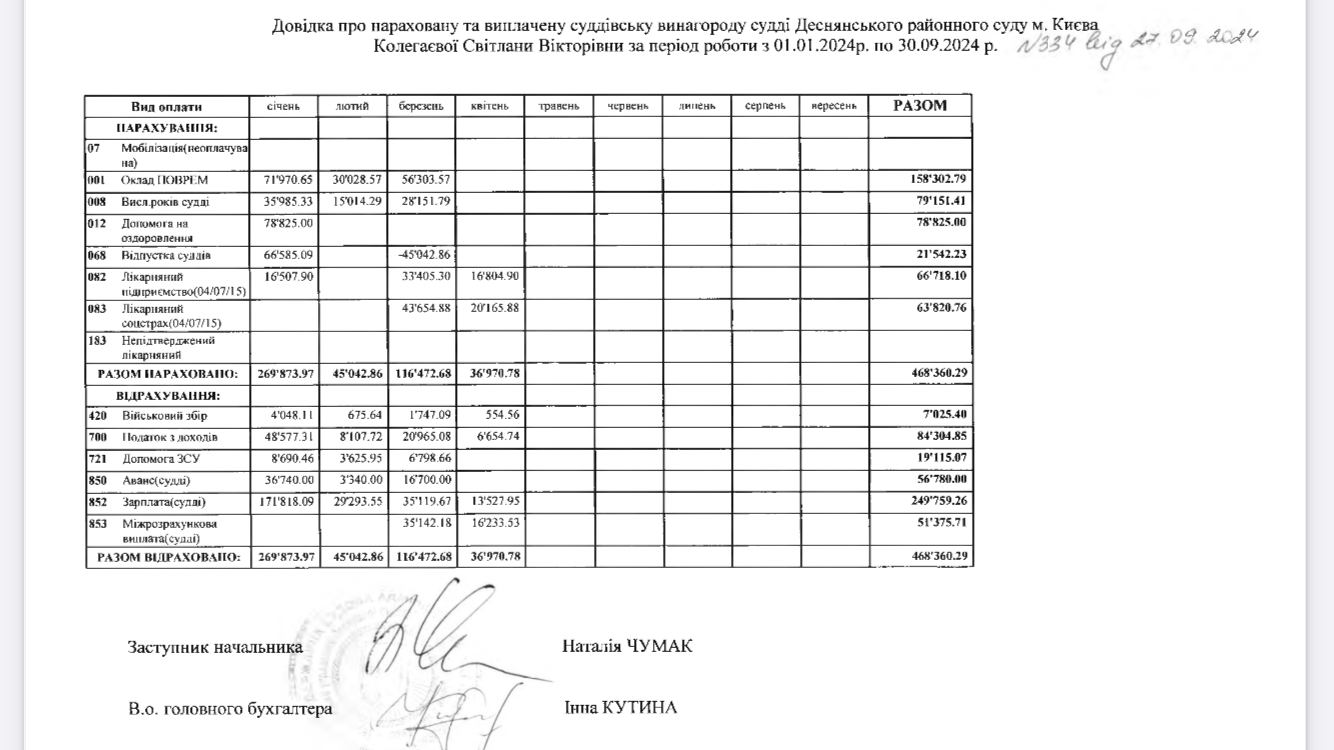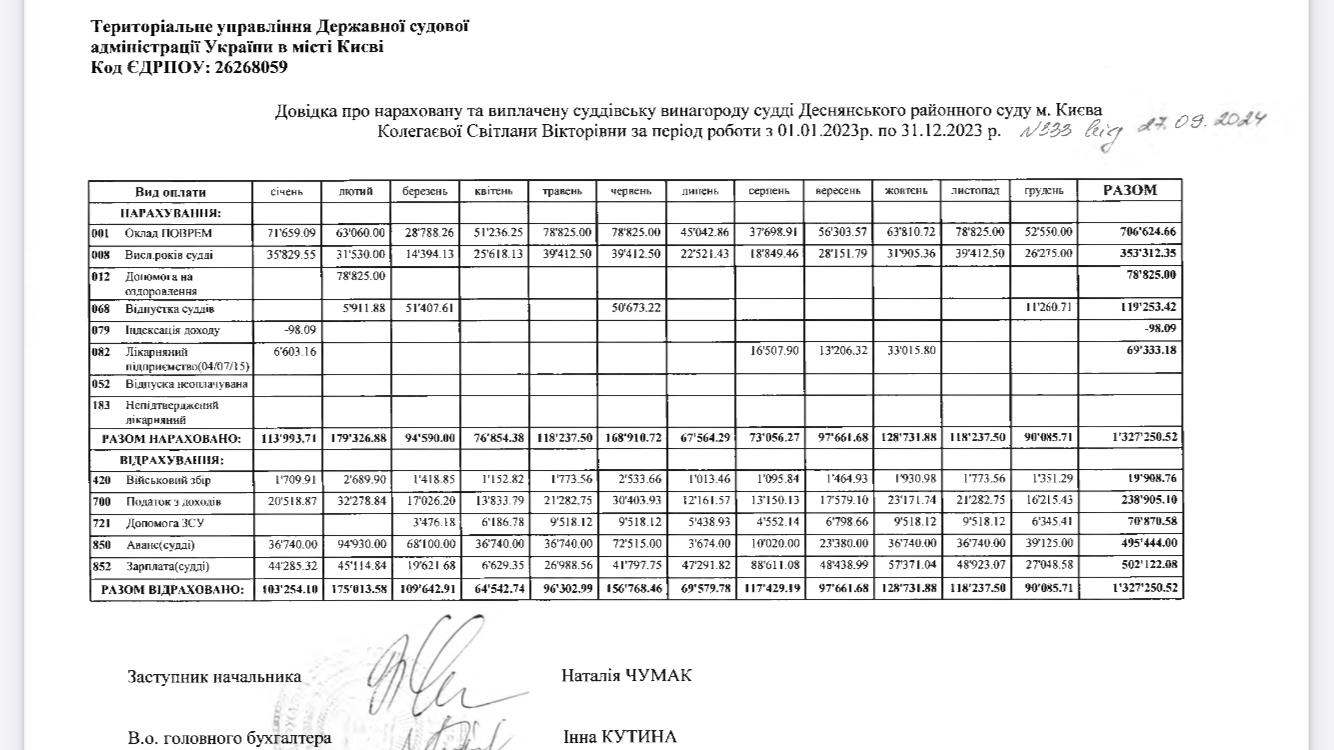 У відповіді Державної судової адміністрації України у Києві на запит Watchers зазначається: у 2023-му році Колегаєвій нарахували 1 327 250 гривень зарплати (без відрахування податків та зборів).