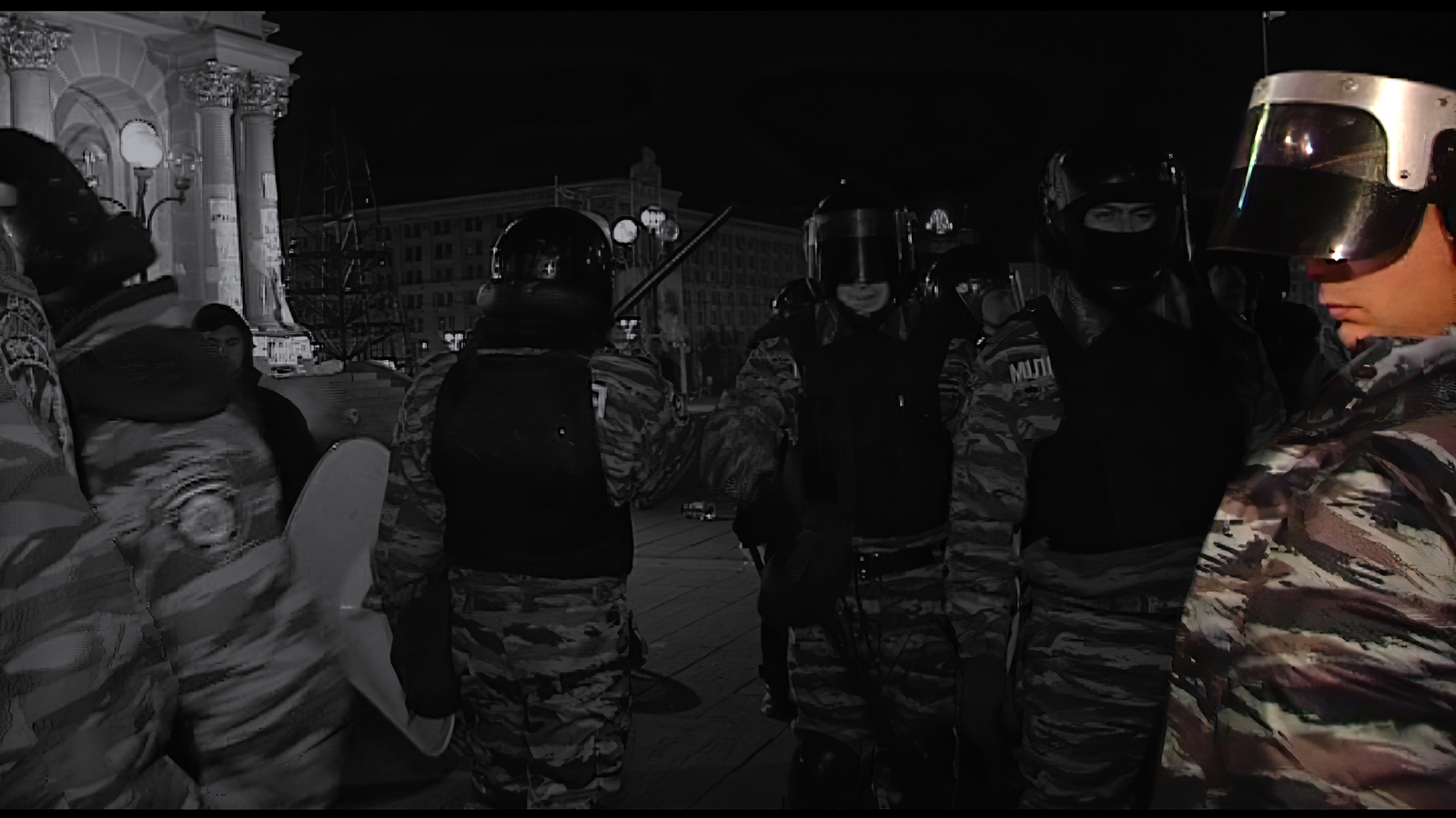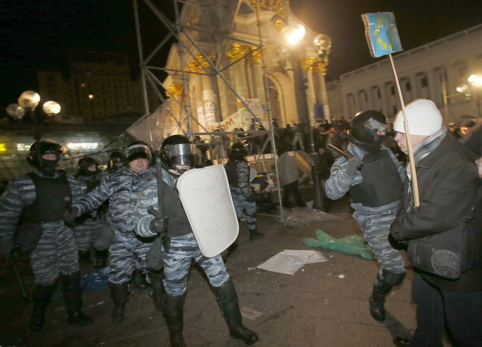 Коли більша частина з протестувальників відбігла від стели в напрямку Хрещатику, бійці «Беркуту» під гучний командний голос когось із командирів рушили за ними.