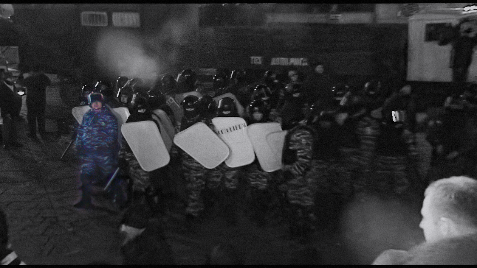 «Беркутівці», серед яких і «щитоносці», почали бити людей під стелою. Один із бійців, як видно на відео, агресивно бив лежачу людину палицею, через що його колега, який перебував поруч, кілька разів вдарив його рукою по шолому та щось сказав, ймовірно заспокоївши його.