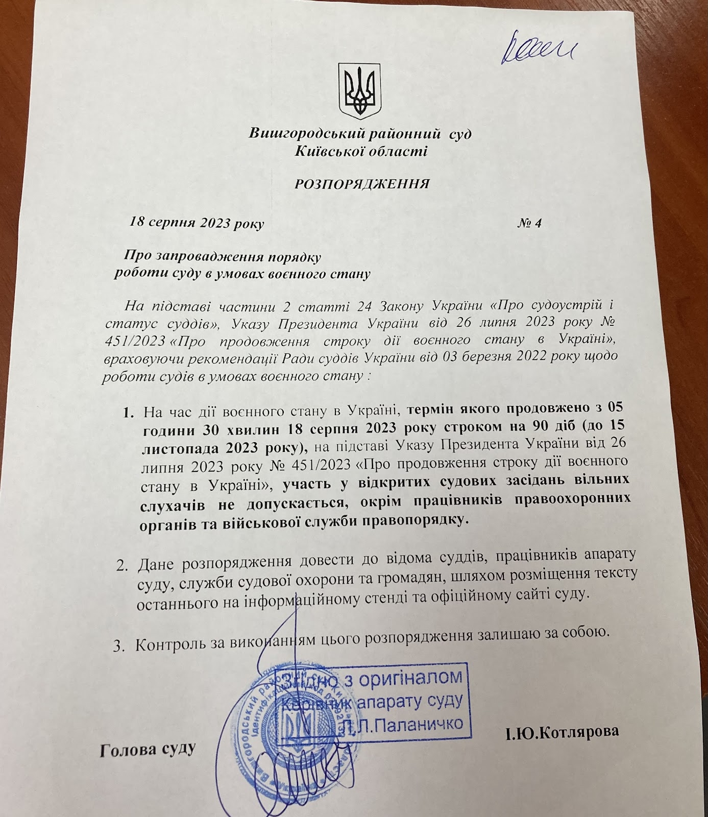 У розпорядженні голови суду №4 від 18-го серпня 2023-го року, чітко написано: на час дії воєнного стану в Україні, термін якого продовжено з 05 години 30 хвилин 18 серпня 2023 року строком на 90 діб (до 15 листопада 2023 року), на підставі Указу Президента України від 26 липня 2023 року No 451/2023 «Про продовження строку дії воєнного стану в Україні», участь у відкритих судових засідань вільних слухачів не допускається, окрім працівників правоохоронних органів та військової служби правопорядку.
