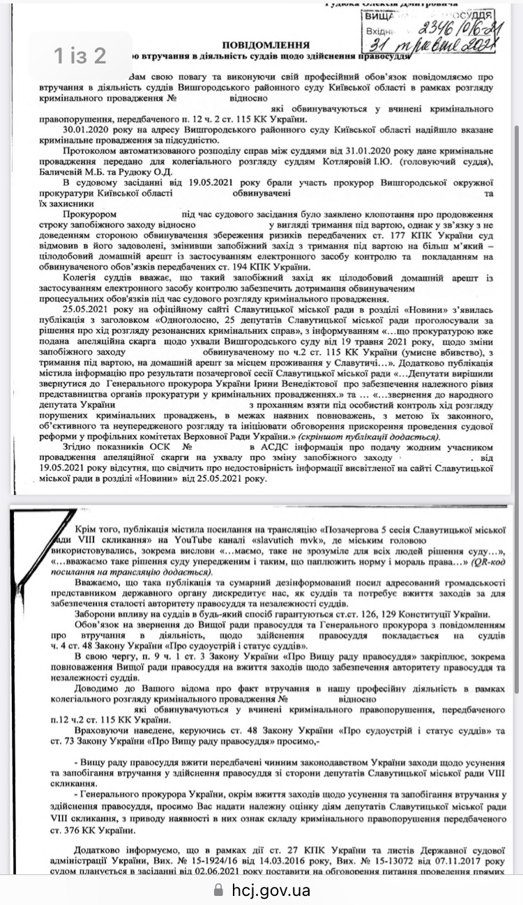 У повідомленні про втручання суддя вказала цитату з новини, яка їй не була до вподоби, а саме: «…прокуратурою вже подана апеляційна скарга щодо ухвали Вишгородського суду від 19 травня 2021 року, щодо зміни запобіжного заходу обвинуваченому по ч.2 ст. 115 КК України (умисне вбивство), з тримання під вартою, на домашній арешт за місцем проживання у Славутичі…».