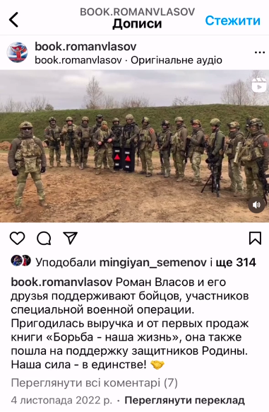 На ньому люди у військовій формі російської армії дякують Роману Власову за «надану підтримку». В коментарі ж до відео зазначається, що «Роман Власов і його друзі підтримують бійців, учасників СВО. В нагоді став прибуток від перших продажів книги «Боротьба – наша життя», він також пішов на підтримку захисників Батьківщини».