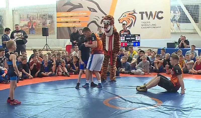 Євгеній Байдусов разом з Артемом Сурковим в місті Бор провів майстер-клас згреко-римської боротьби для дітей у футболці з літерою Z.