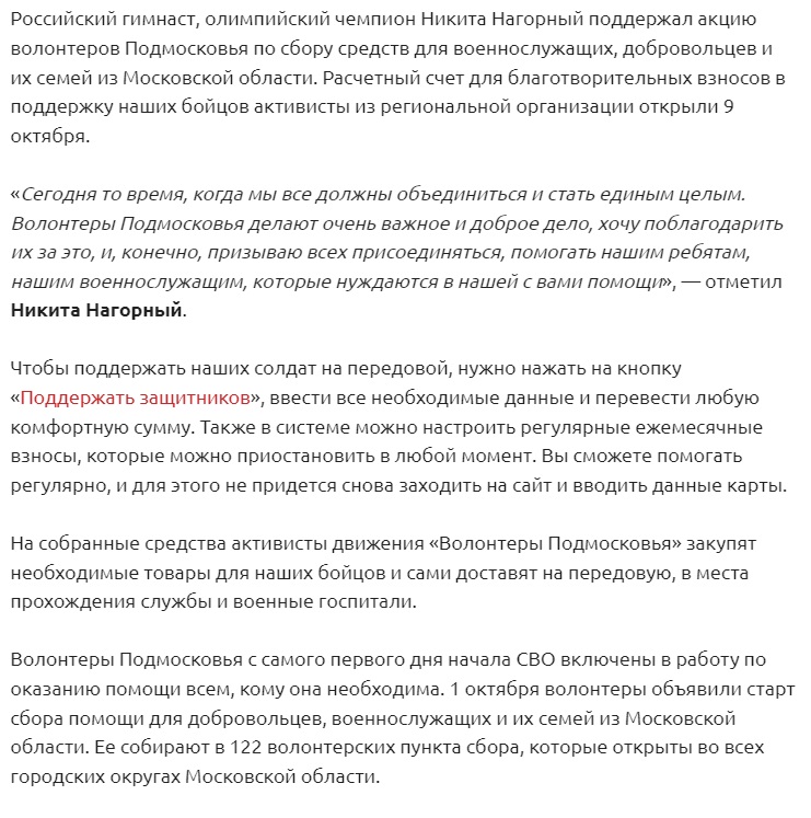 Ще Нагорний брав участь в різноманітних акціях фандрейзингу щодо запитів військових з РФ (до прикладу, цей спортсмен, який є одним з лідерів російської збірної зі спортивної гімнастики, рекламував акцію “Доброе дело”, яка мала на меті фінансову допомогу окупантам), а також здійснював візити до госпіталів з пораненими російськими окупантами.