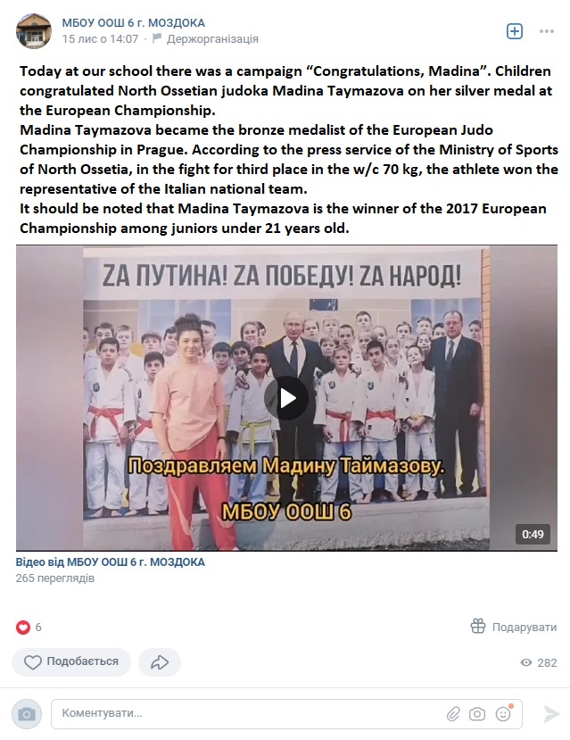 Students of School No. 2 (Gizel village) even printed out a photo with Taimazova, Putin and the letter Z as a congratulatory greeting. The video of this school also contains a propaganda thesis that “the success of Russian athletes motivates the fighters of the special military operation and helps them to believe in their strength.