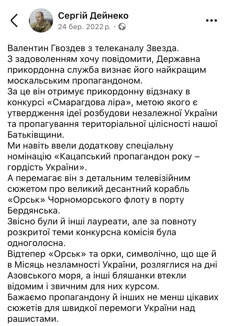 Ще у 2022-му році голова Державної прикордонної служби Сергій Дейнеко писав у своєму Facebook, що російські пропагандисти з телеканалу «Звезда» допомогли ЗСУ знищити російський десантний корабель «Орск» в порту Бердянська.
