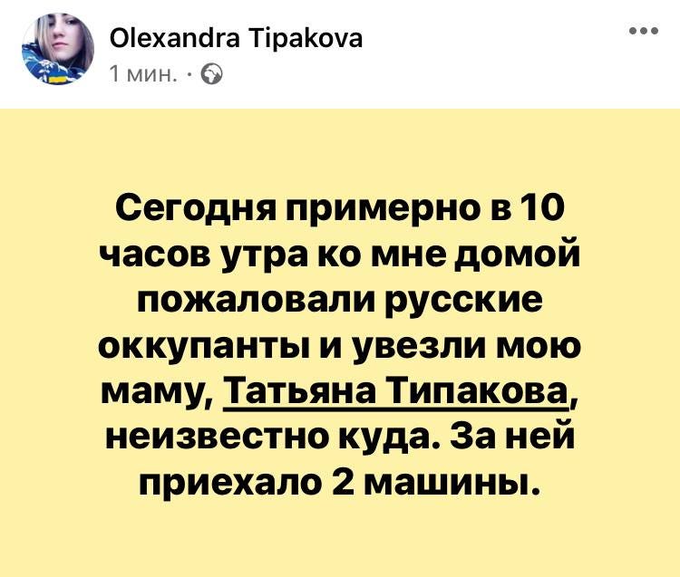 А вже у неділю 20-го березня місцеве видання «БРД24» повідомило: російські військові викрали і саму Тетяну Тіпакову. На підтвердження виклади публікацію її дочки у одній з місцевих груп у Facebook.