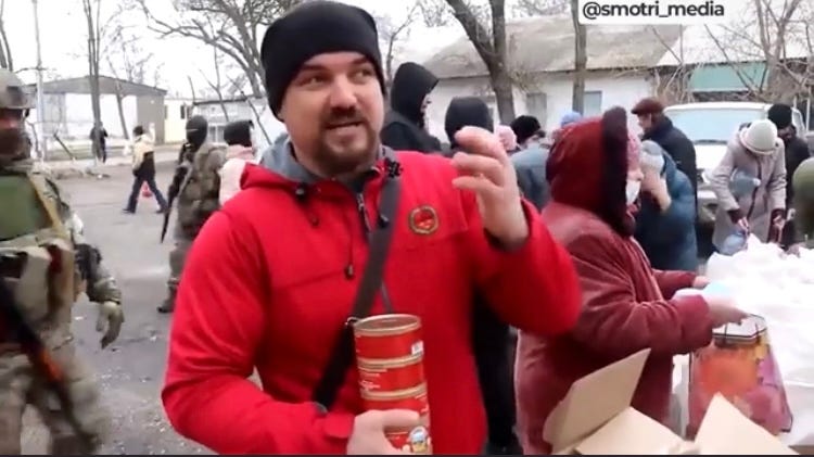 Бердянський активіст у Twitter виклав відеозапис того, як нечисельна частина населення отримує харчі від окупантів. Він записав коротке інтерв’ю одного зі зрадників. Останній заявив: «Я вчора ввечері мріяв, аби «Росія 24» приїхала. Я би хотів дати інтерв’ю. Я вдячний за те, зо зараз відбувається. Давно це мало відбутися. Ніякого майбутнього у України не було».
