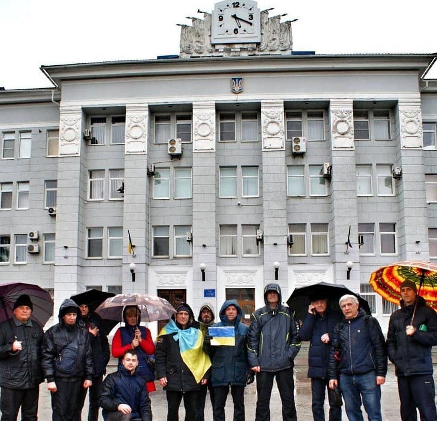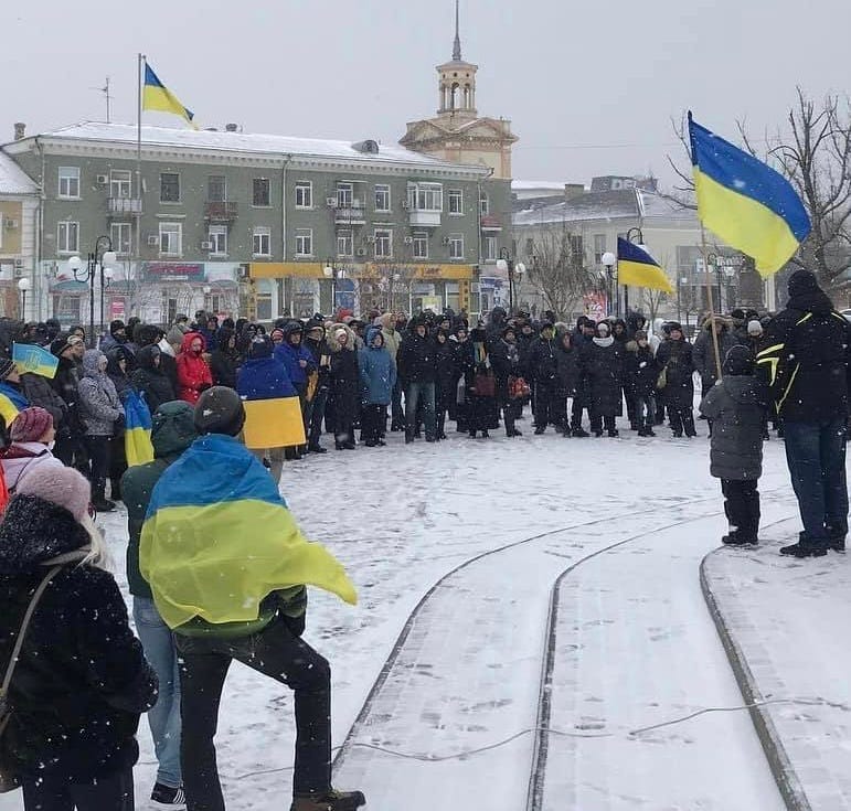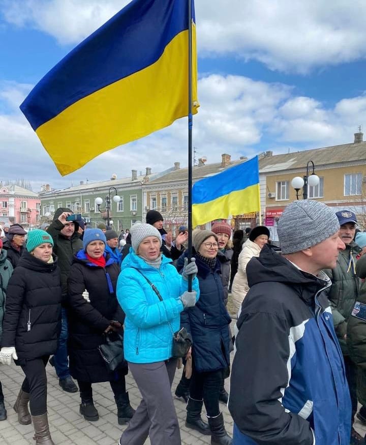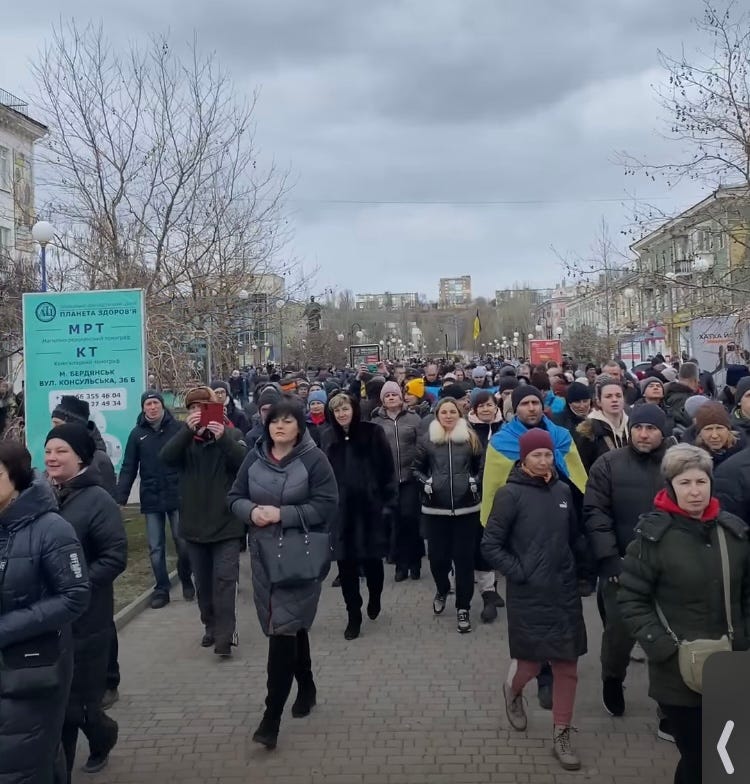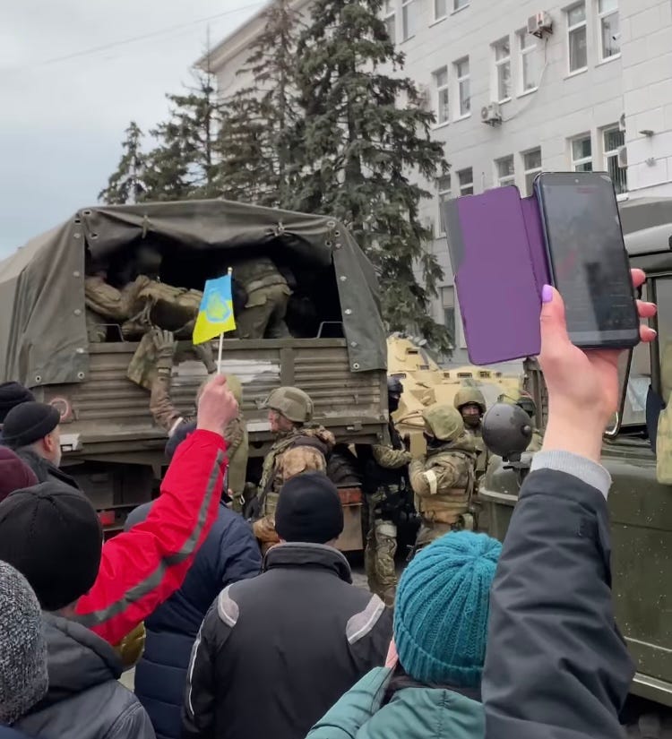 28-го лютого, у перший день окупації, місцеві вийшли до Бердянської міськради, оточеної солдатами армії РФ, на мітинг.