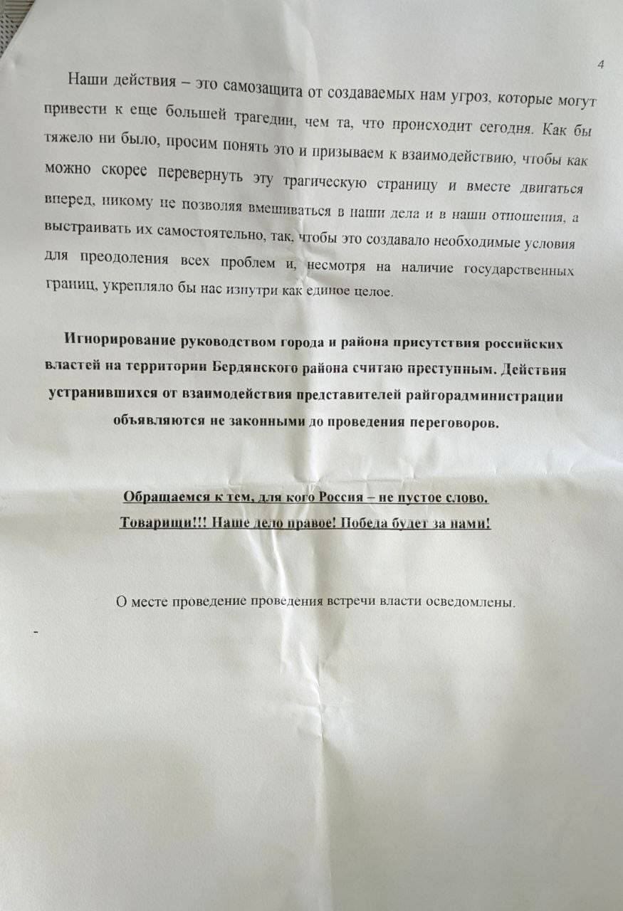 У Бердянську військовослужбовці російських збройних формувань з першого дня окупації поширювали листівки з антиукраїнською пропагандою. У тексті звернення до громадян, росіяни апелюють до якогось буцімто спільного минулого, називають діючий демократичний режим в Україні фашизмом. Окупанти пишуть, що два останніх президенти начебто не зупинили кровопролиття на Донбасі, а відтак — російські військові прийшли, так би мовити, рятувати українців. Одразу помітно, що в поширеному тексті безліч помилок: від синтаксичних і пунктуаційних до логічних і сенсових.