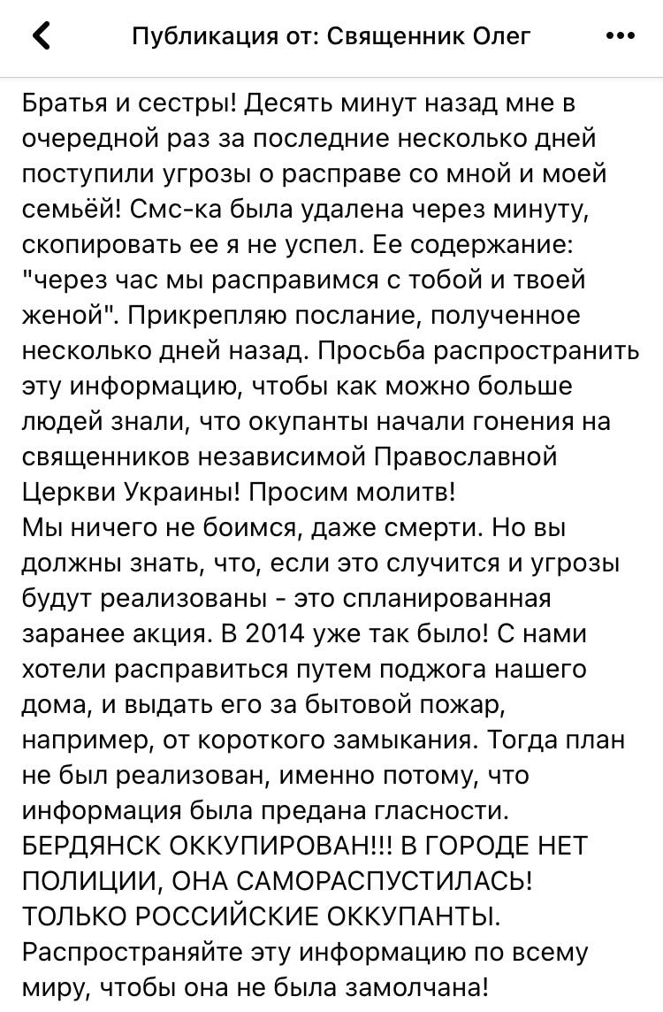 Зараз пост священика про погрози закритий, як і доступ до всього вмісту сторінки — він скористався можливістю закрити аккаунт від сторонніх. Позиція Олега — проактивна та проукраїнська. Майже щодня він публікував на своїй сторінці хроніки супротиву Бердянська.