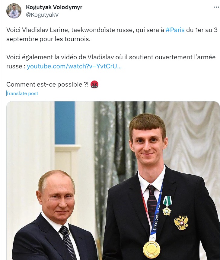 “Ось Владислав Ларін, російський тхеквондист, який буде змаганнях у Парижі з 1 по 3 вересня. А ось і відео Владислава, де він відкрито підтримує російську армію. Як це можливо?!”, – обурювався Когутяк.