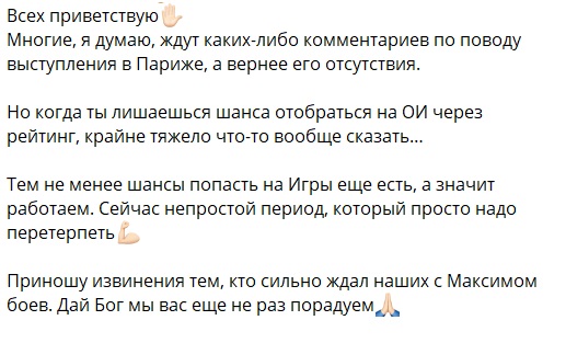 “Багато хто, я думаю, чекає будь-яких коментарів з приводу виступу в Парижі, а вірніше його відсутності. Але коли ти втрачаєш шанс відібратися на ОІ через рейтинг, вкрай важко щось взагалі сказати…Проте шанси потрапити на Ігри ще є, а отже працюємо. Зараз непростий період, який просто треба перетерпіти”, – написав він.