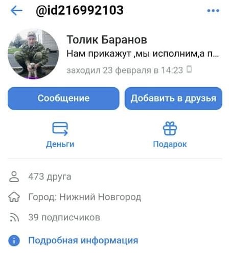 У графі статус в верхній частині профілю у соцмережі вконтакті окупант написав: «нам прикажут, мы исполним».