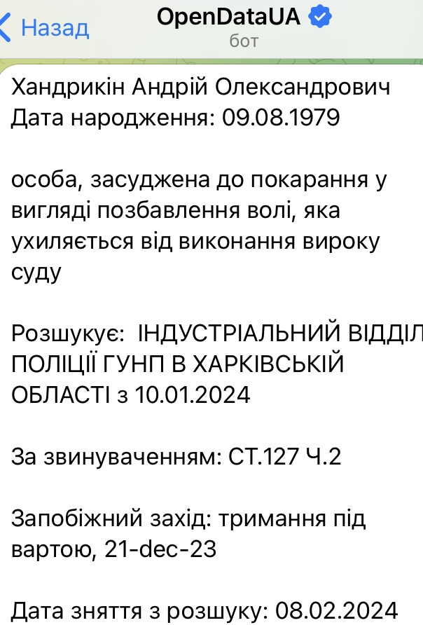 Однак 8 лютого Хандрикіна з розшуку зняли. Співрозмовник Watchers у правоохоронних органах підтвердив: засуджений переховувався, але його затримали. Відтепер Хандрикіна мають доставити до місця відбування покарання.