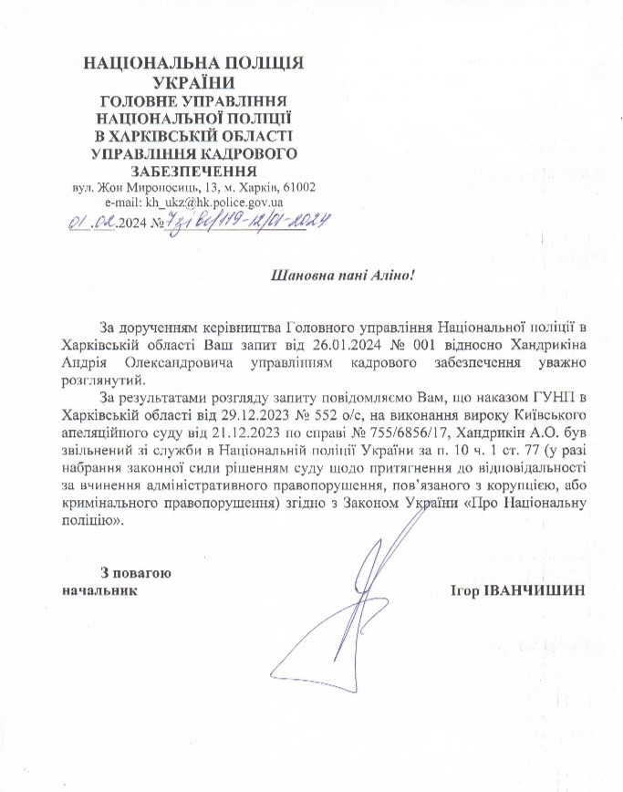 «Наказом ГУНП в Харківській області від 29.12.2023 Nº 552 о/с, на виконання вироку Київського апеляційного суду від 21.12.2023 Хандрикін А.О. був звільнений зі служби в Національній поліції України за п. 10 ч. 1 ст. 77 (у разі набрання законної сили рішенням суду щодо притягнення до відповідальності за вчинення адміністративного правопорушення, повʼязаного з корупцією, або кримінального правопорушення) згідно з Законом України «Про Національну поліцію», – йдеться у тексті відповіді.