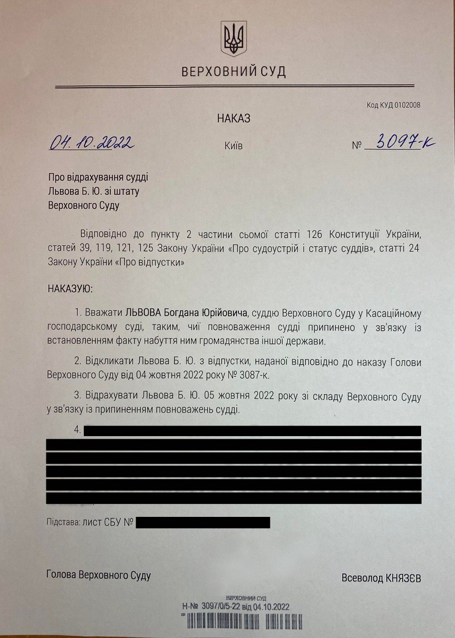 Однак 5-го жовтня 2022-го «Схеми» повідомили: голова Верховного суду Всеволод Князєв відрахував голову Касаційного господарського суду Богдана Львова зі штату Верховного суду.