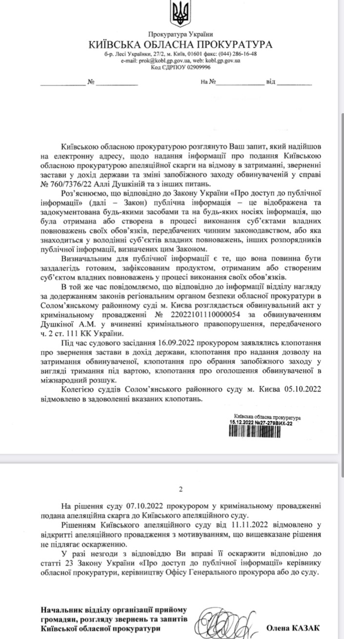 Прокуратура не змогла оскаржити рішення Солом’янського райсуду Києва про відмову у зверненні застави, зміні запобіжного заходу і дозволі на затримання ексдиректорки Печерського ліцею Алли Душкіної. Про це йдеться у відповіді Київської обласної прокуратури на запит Watchers.