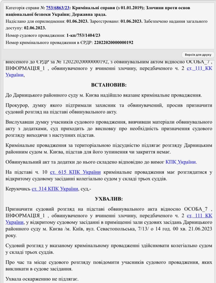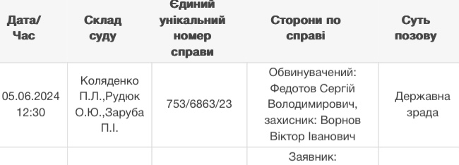 У Дарницькому райсуді Києва 5-го червня о 12:30 було заплановано засідання у справі працівника «Укроборонпрому» Сергія Федотова, якого обвинувачують у державній зраді.