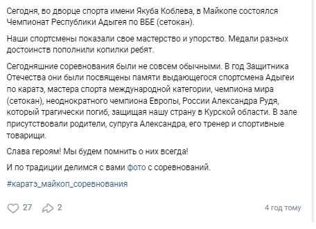 “Сьогоднішні змагання не були зовсім звичайними. У рік Захисника Вітчизни вони були присвячені пам’яті видатного спортсмена Адигеї з карате, майстра спорту міжнародної категорії, чемпіона світу (шотокан), неодноразового чемпіона Європи, Росії Алєксандра Рудя, який трагічно загинув, захищаючи нашу країну в Курській області. У залі були присутні батьки, дружина Алєксандра, його тренер та спортивні товариші”, – зазначалося у дописі.