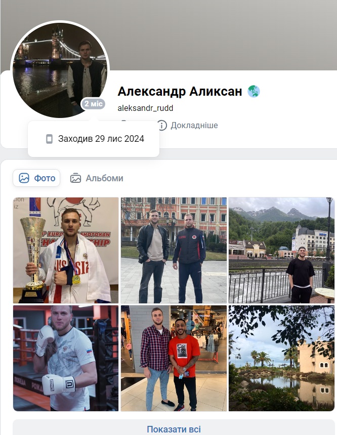 На сторінку самого Алєксандра у Вконтакте востаннє власник паролів заходив 29-го листопада 2024 року.