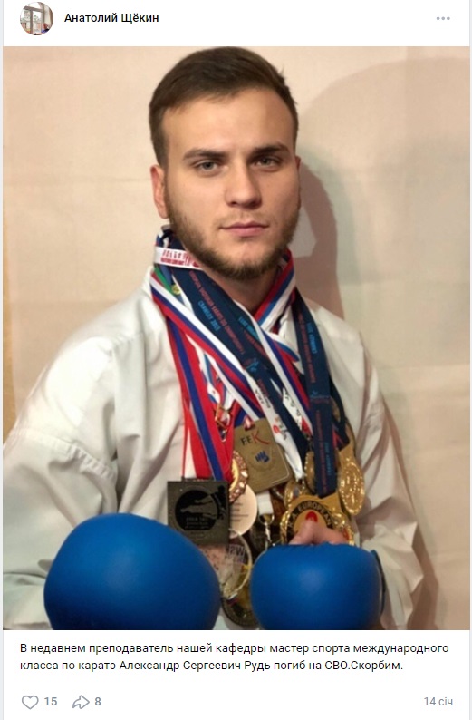 “У нещодавньому викладач нашої кафедри майстер спорту міжнародного класу з карате Алєксандр Сєргєєвіч Рудь загинув на СВО. Сумуємо”, – йшлося у дописі.