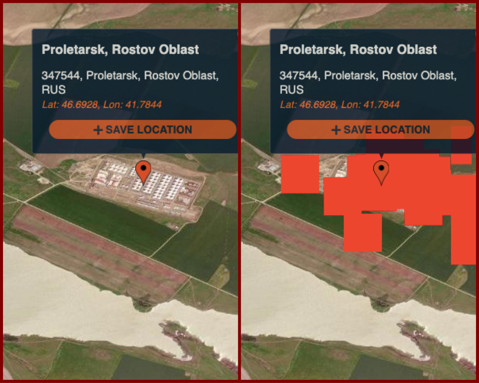 На знімку вище від 16 серпня можна побачити неушкоджений стан нафтобази. А вже на знімку від 18 серпня об 11:19 за Київським часом добре помітно пожежу та стовпи чорного диму.