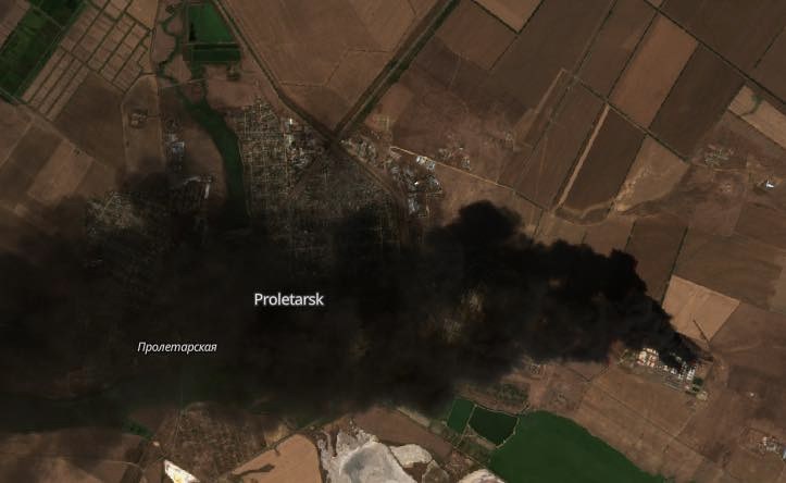 Зокрема, 18 серпня горіло щонайменше 6 резервуарів – і вогню ще було куди перекидатись. Місто Пролєтарск накрила хмара чорного диму, яку видно з космоса