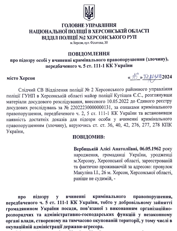 У березні 2024-го року Вербицькій заочно повідомили про підозру у колабораційній діяльності. За даними слідства, Вербицька з червня до листопада 2022-го року займала посаду «начальника отдела развития объектов права коммунальной собственности» в окупаційній адміністрації держави-агресора.