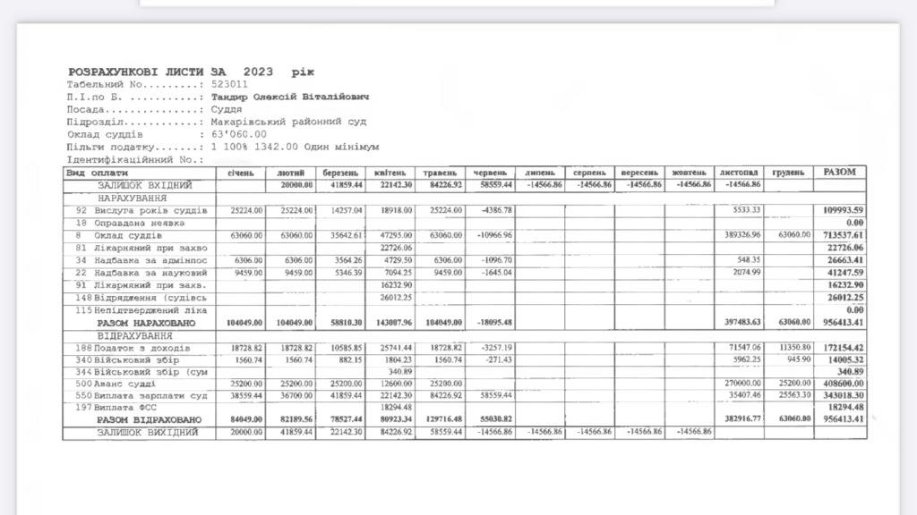 З тексту відповіді судової адміністрації на наш запит випливає, що у 2023 році Тандир мав фіксований оклад судді – 63060 гривень. Але додатково йому також нараховувалась виплата за вислугу років, надбавка за науковий ступінь та надбавка за перебування на адміністративній посаді в суді. Також були виплати за відрядження і лікарняний.