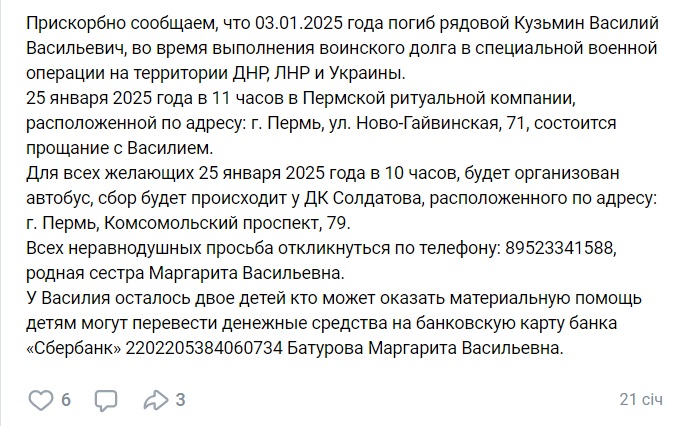 “Сумно повідомляємо, що 03.01.2025 року загинув рядовий Кузьмін Василь Васильович, під час виконання військового обов’язку у спеціальній військовій операції на території ДНР, ЛНР та України”, – йшлося у дописі.