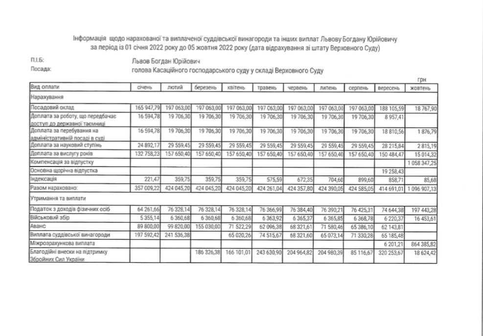 Із відповіді Верховного суду на наш запит випливає, що Богдану Львову у період з січня 2022 по жовтень 2022 року нараховано 4 838 336 гривень (сума без відрахувань податків та зборів) заробітної плати. Сума включає такі складові: