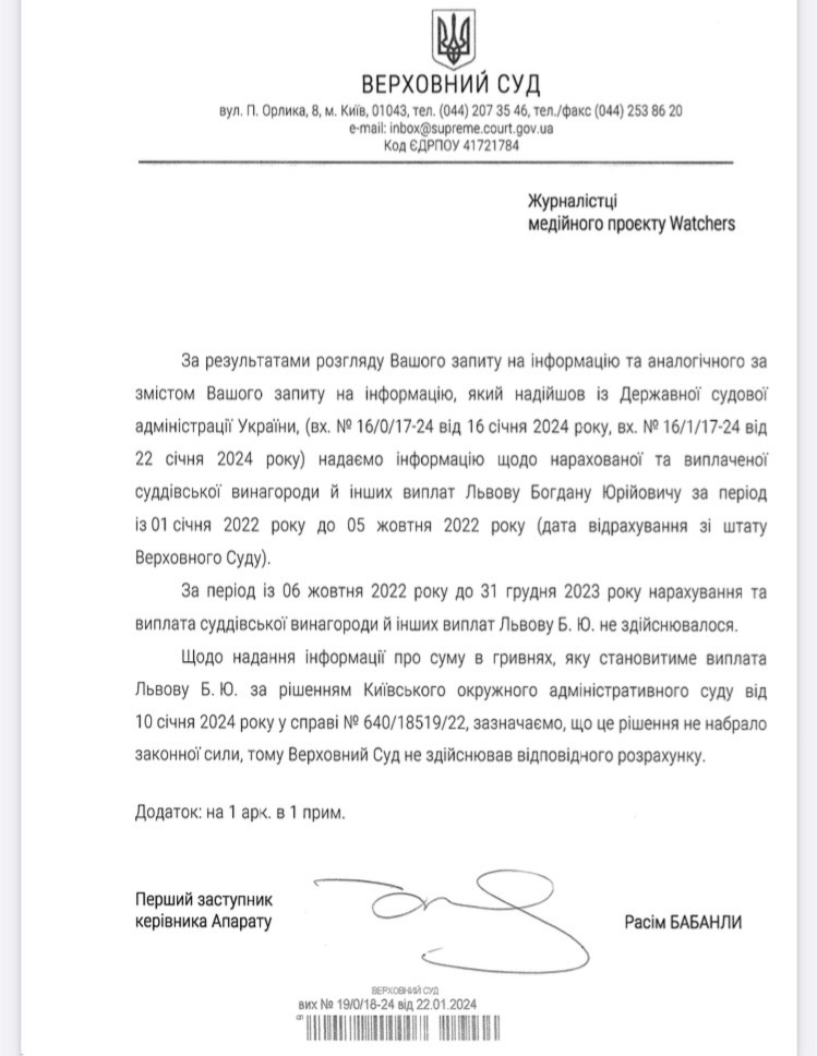 Про це йдеться у тексті відповіді Верховного суду України на запит Watchers, у якому також повідомили дані про зарплату Львова у 2022 році.