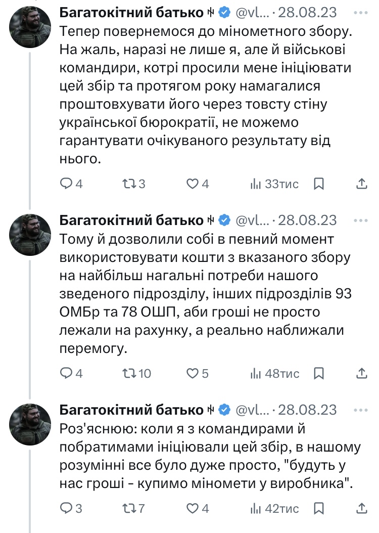 Після того, як ця історія набула широкого розголосу, у соцмережі «Х» у Сорда запитали щодо результатів та звіту по його збору на міномети, який він відкрив ще влітку 2022-го року. Восени того ж року він писав, що закрив збір, оскільки вдалося зібрати 3,5 млн гривень. А потім повідомляв, що міномети нібито вже у Києві.