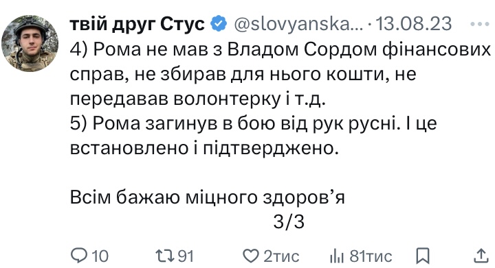 Крім того, нинішній підозрюваний приписував собі нібито дружбу з активістом та громадським діячем Романом Ратушним, який загинув на російсько-українській війні. Проте родичі та друзі Романа це заперечують.