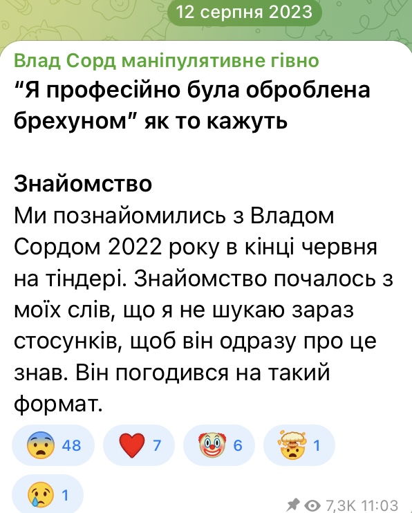 Одна з дівчат створила свій телеграм-канал, в якому розповіла про початок знайомства з нині підозрюваним. Сорд на той час був одруженим.
