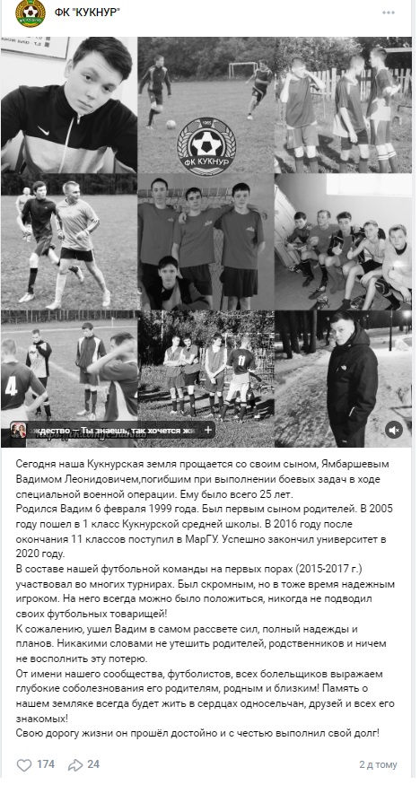 Саме на сторінці “Кукнура” у Вконтакте і з’явилася інформація про ліквідацію окупанта. Зазначається, що він був “скромним, але надійним гравцем”, а ще “на нього завжди можна було покластися, ніколи не підводив своїх футбольних товаришів”.