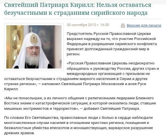 Примітно, але на сайті РПЦ у 2015-му році опубліковано текст, з якого випливає, що патріарх «благословляв» дії росії і в Сирії.