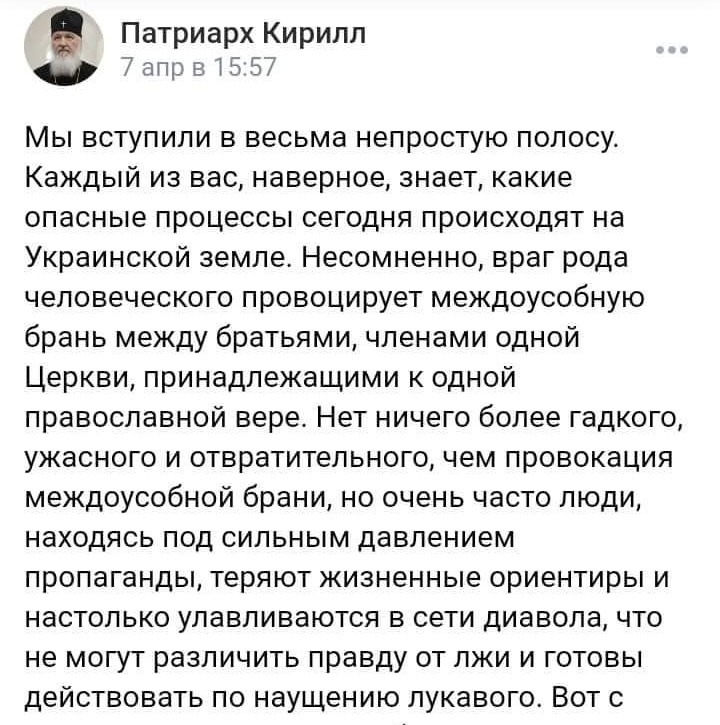 Він називав українців «нещасними, затьмареними націоналізмом людьми». Саме Кіріл, підігруючи кремлю, називав війну в Україні (розв’язану росією) внутрішнім конфліктом.