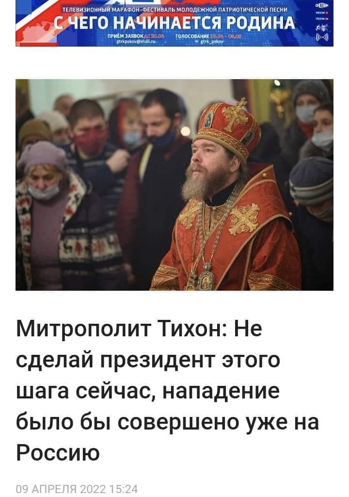 Тихон відкрито виправдав напад росії на Україну. Так, на російських «Вєстях» 9-го квітня 2022 року вийшла замітка з цитатою цього діяча, де він заявив: «якщо б путін не бачив необхідних, важливих та критичних для народу росії показань для військової спецоперації, він би її не почав».