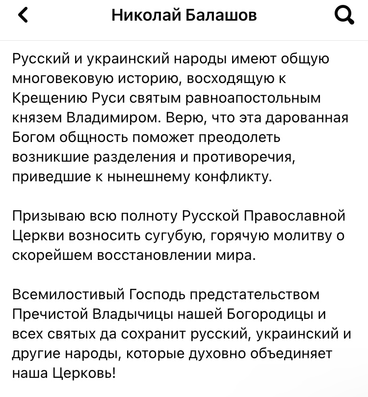 «Вірю, що ця дарована Богом спільність допоможе подолати поділи і протиріччя, що виникли, що призвели до нинішнього конфлікту. Закликаю всю повноту руської православної церкви підносити сугубу, гарячу молитву за якнайшвидше відновлення миру», – написав він.