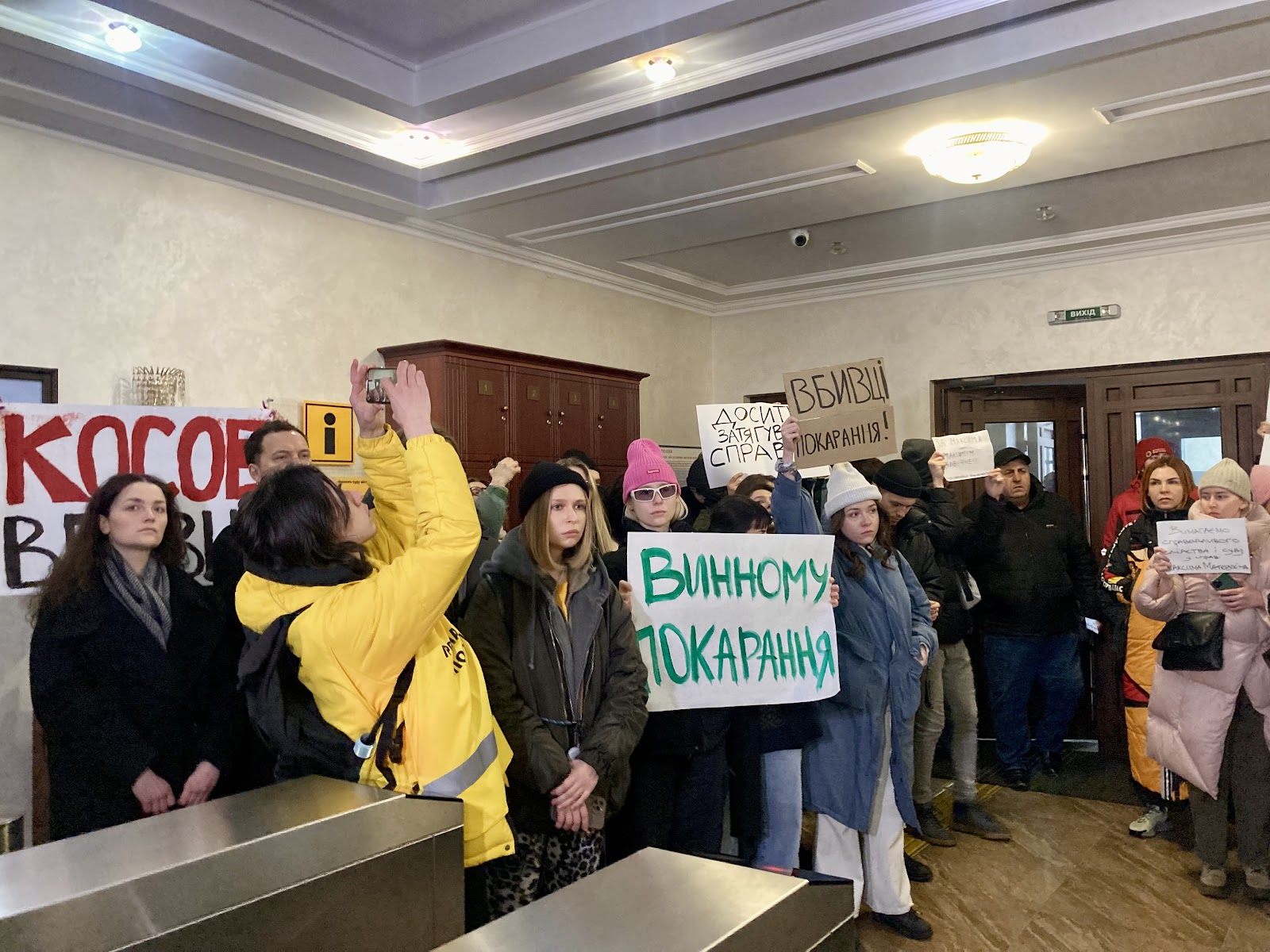 До Косова, який був працівником Управління державної охорони України на момент події, щоразу в суд приходить його група підтримки. Не стало виключенням і 5-те лютого. Перед початком слухання, у коридорі суду, родичка Косова вихопила у журналістки телефон і вдарила її. Інцидент потрапив на відео.