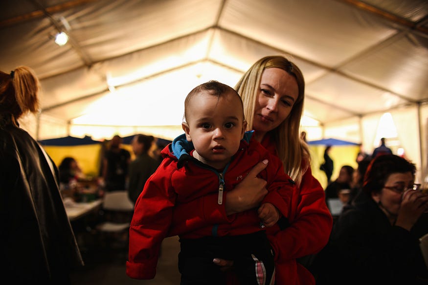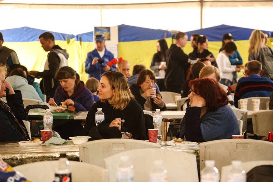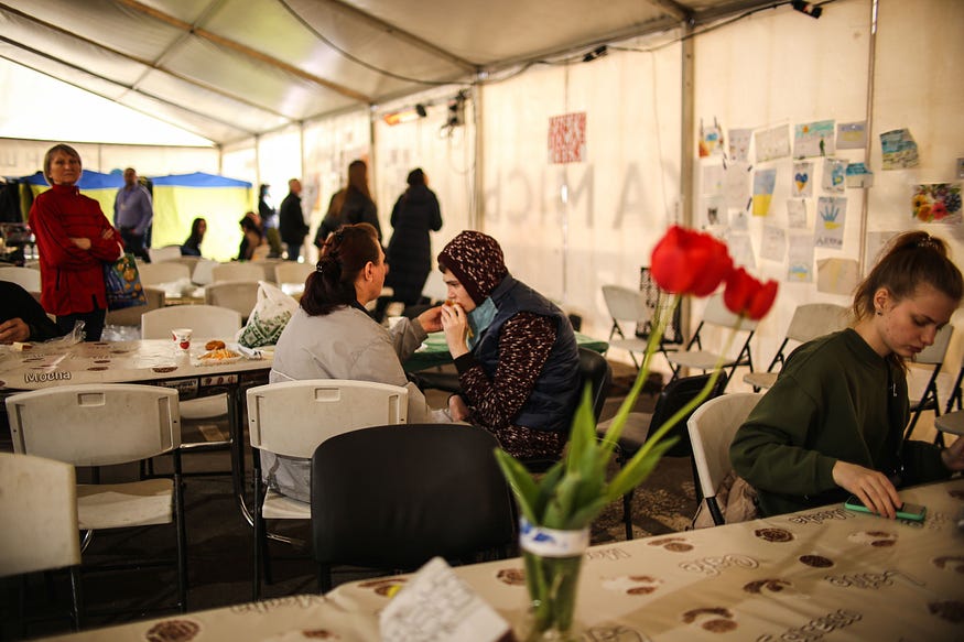 Процедура наступна — всіх людей по приїзду тут спершу реєструють, оглядають на наявність травм, надають медичну допомогу. Потім, у великому наметі, люди можуть отримати їжу, воду, всю необхідну інформацію.