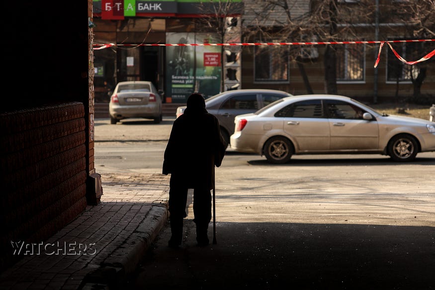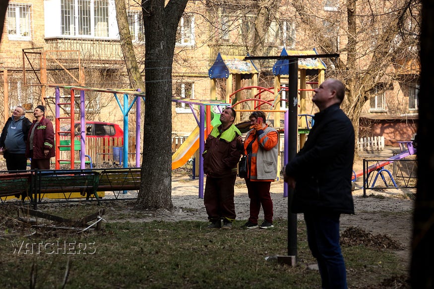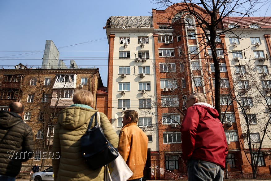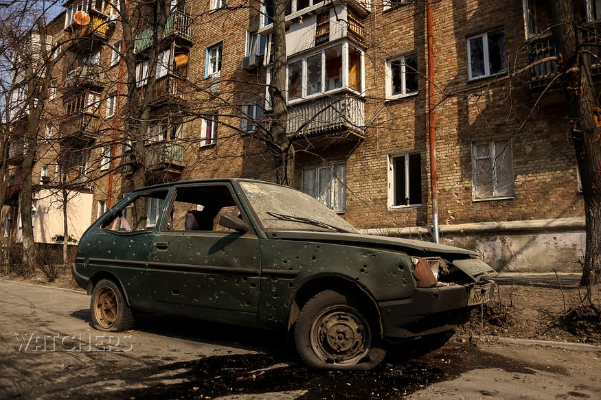 Люди на вулиці дивляться на пошкоджені російським обстрілом будинки. Київ, 23 березня.Зруйноване російським обстрілом відділення пошти. Київ, 23 березня.Знищене обстрілом окупантів авто на тротуарі у Шевченківському районі. Київ, 23 березня.