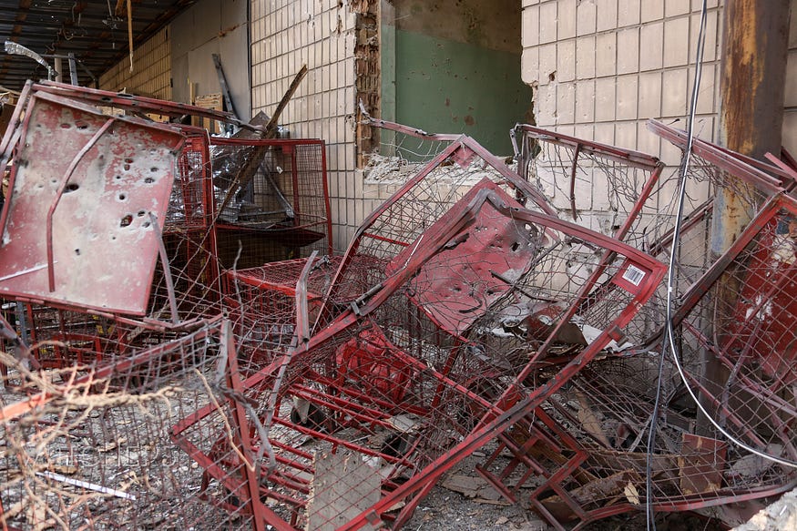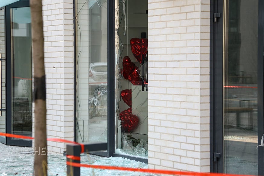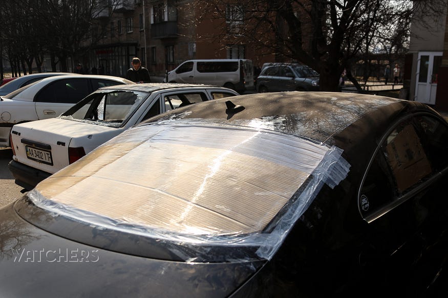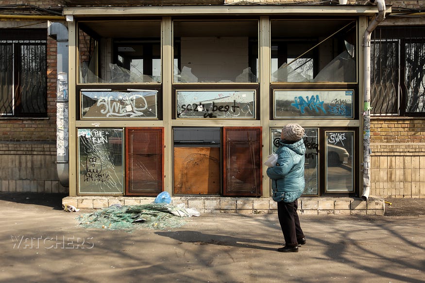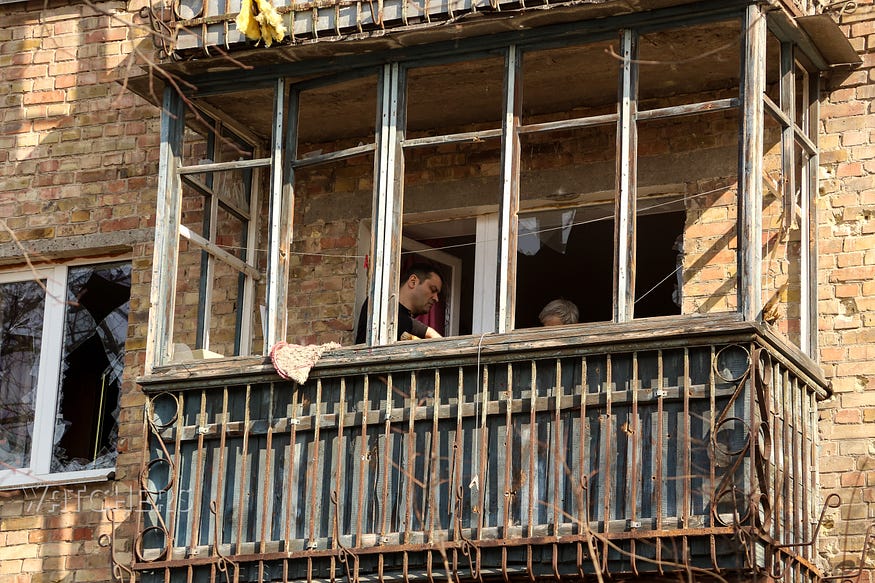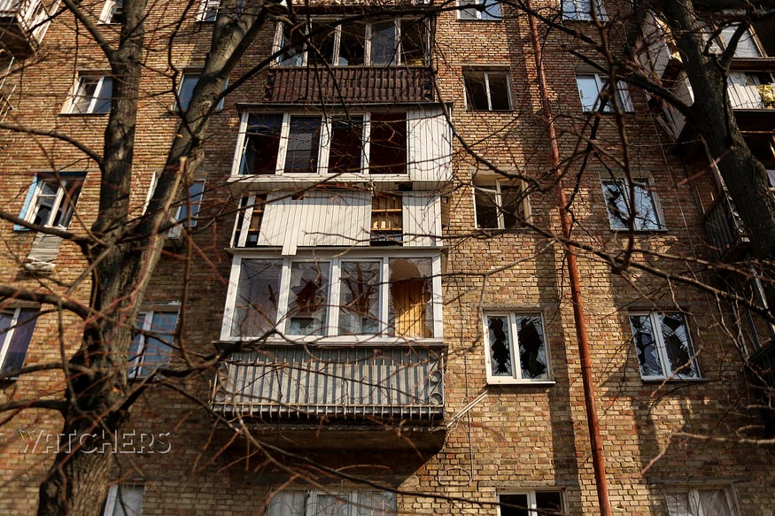 Вітрина магазину після обстрілу окупантами. Київ, 23 березня.Пошкоджена обстрілом автівка та будівля на території житлового комплексу. Київ, 23 березня.В будинках після російського обстрілу вже розпочали відновлювальні роботи. Київ, 23 березня.