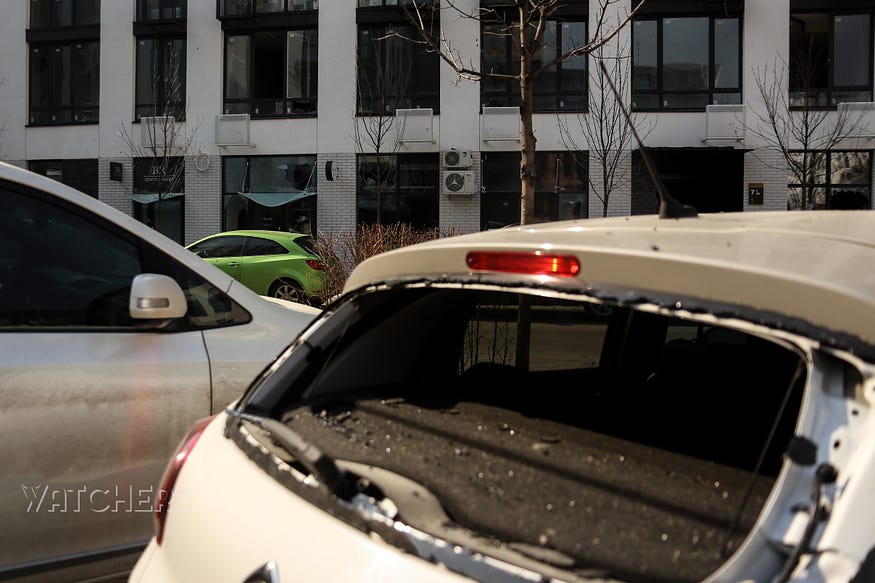 У цьому місці ворожі снаряди здебільшого влучили в дахи будинків. Уламки яких пошкодили багато автомобілів.