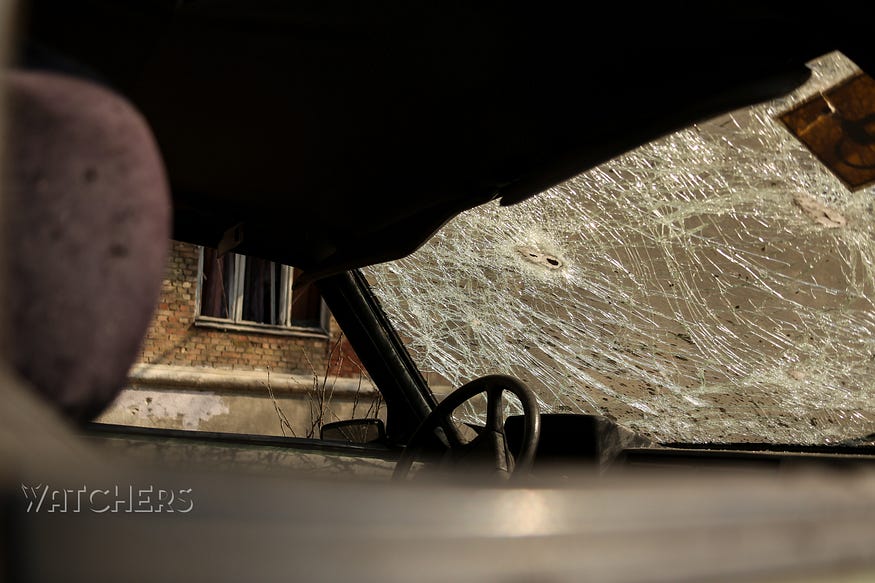 Вид зсередини пошкодженої російським обстрілом автівки. Київ, 23 березня.