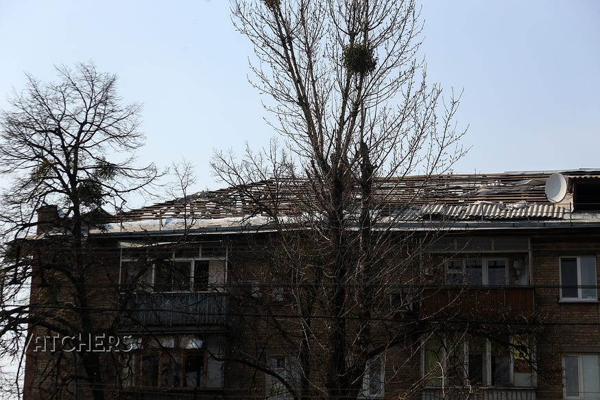 Зруйнований російським обстрілом дах житлового будинку. Київ, 23 березня.Вибиті вікна в будинку внаслідок влучання російського снаряду в дах. Київ, 23 березня.Потрощені внаслідок російського обстрілу та вже заклеєні вікна автівок. Київ, 23 березня.Вид з потрощеної внаслідок російського обстрілу автівки. Київ, 23 березня.Мешканці квартири усувають наслідки руйнувань їхньої домівки російським обстрілом. Київ, 23 березня.Працівники комунальної служби на пошкодженому російським обстрілом даху будинку. Київ, 23 березня.Ще один пошкоджений російським обстрілом дах будівлі. Київ, 23 березня.Мешканці та комунальні працівники спостерігають за усуненням наслідків руйнувань будівлі. Київ, 23 березня.Двір, який засипало уламками внаслідок російського обстрілу. Київ, 23 березня.Жінка похилого віку шукає вхід до бомбосховища поблизу зруйнованого обстрілом відділення банку. Київ, 23 березня.Літня жінка на фоні руйнувань внаслідок обстрілу будинку, в якому вона живе. Київ, 23 березняМалюнок вже знищеного окупантами найбільшого в світі літака “Мрія” та місце влучання чергового російського снаряду.